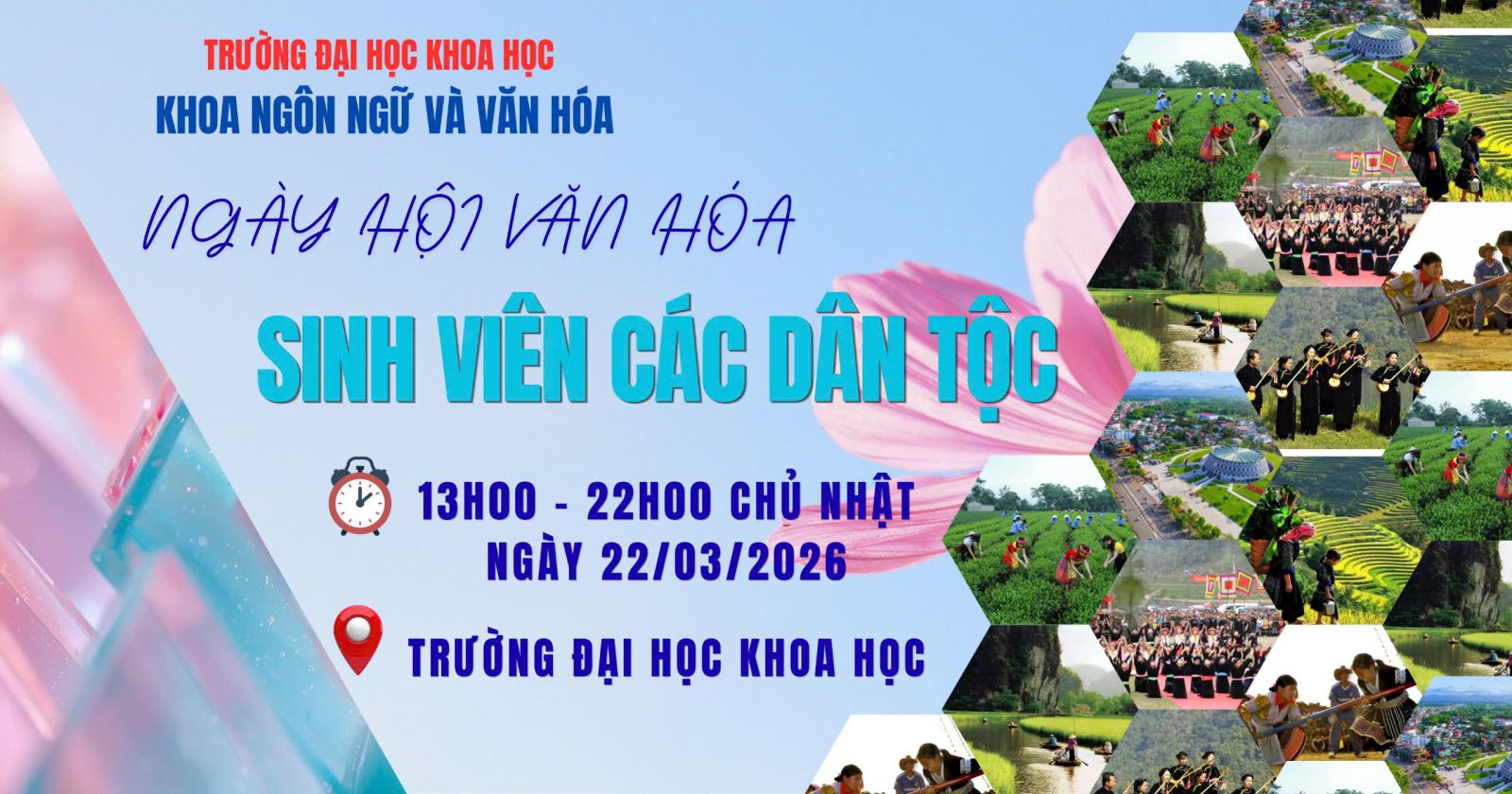 Đáp ứng sự mong đợi của sinh viên Trường Đại học Khoa học, Khoa Ngôn ngữ và Văn hóa sẽ tổ chức Ngày hội Văn hóa sinh viên các dân tộc năm 2026. Sự kiện diễn ra từ 13h00 - 22h00, Chủ nhật, ngày 22/03/2026 tại khuôn viên Trường Đại học Khoa học. Ngày hội hứa hẹn là không gian gặp gỡ, giao lưu và tôn vinh bản sắc văn hóa đa dạng trong cộng đồng sinh viên.
