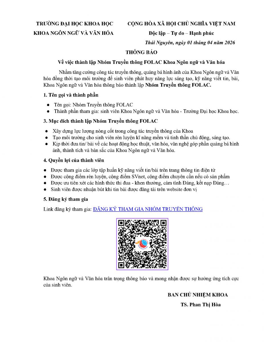 Thông báo về việc thành lập Nhóm Truyền thông FOLAC Khoa Ngôn ngữ và Văn hóa